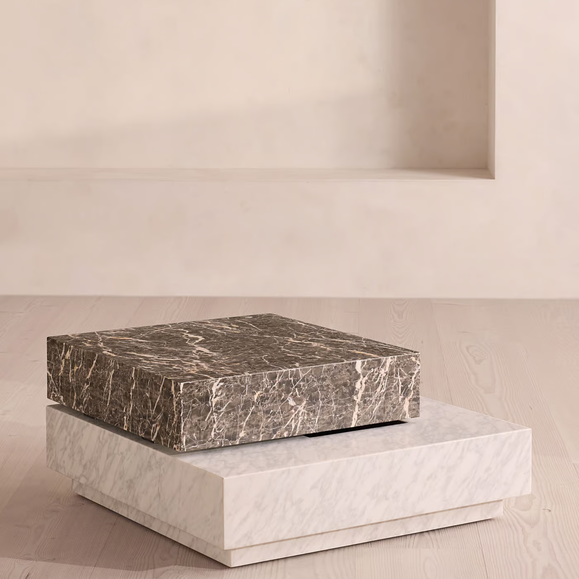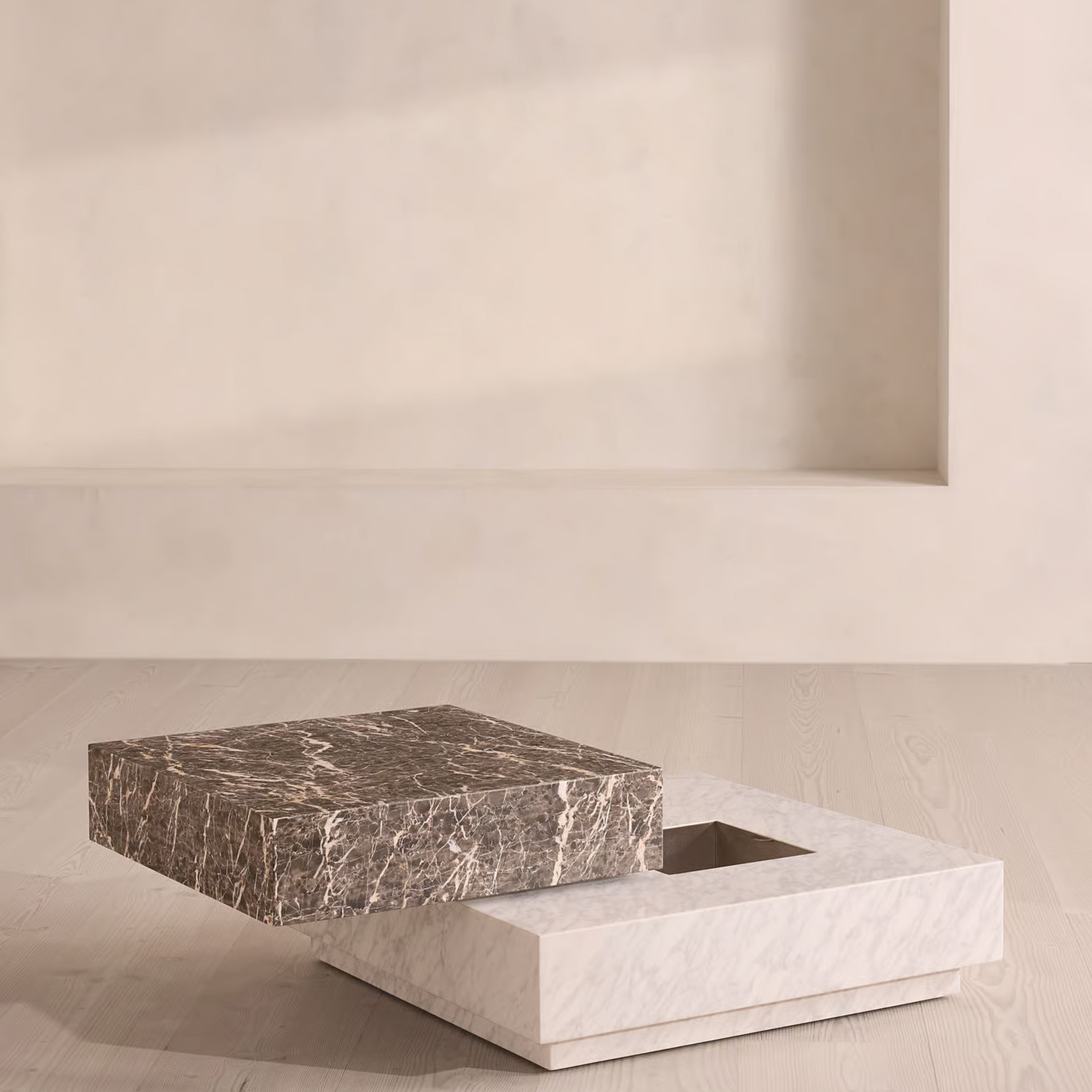 A sculptural centerpiece for modern interiors, the Soho Home Roscoe Coffee Table features stacked Arabescato and Griseo Rosa marble blocks that create a floating, architectural silhouette. Designed to elevate contemporary living rooms, it blends luxury materials with functional storage for a refined, gallery-like aesthetic.