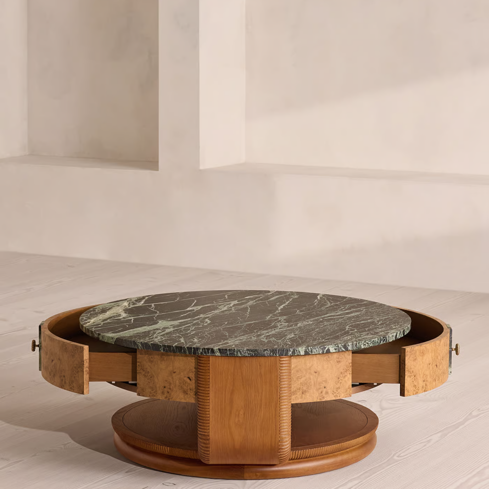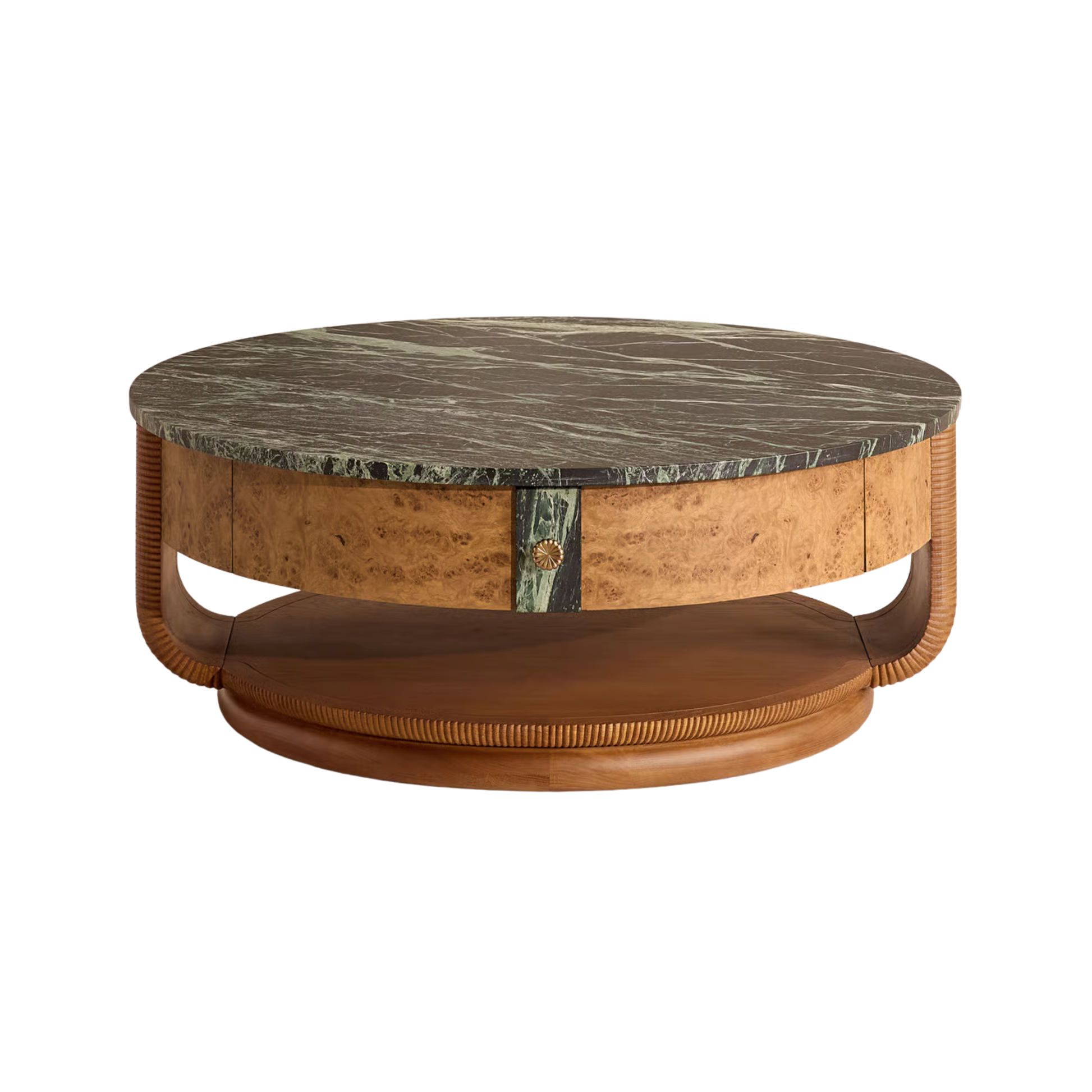 The Soho Home Basil Coffee Table blends sculptural mid-century design with contemporary craftsmanship, featuring a round Napoli green marble top, oak burl cabinetry, and elegant brass-finished details that elevate any modern living room.