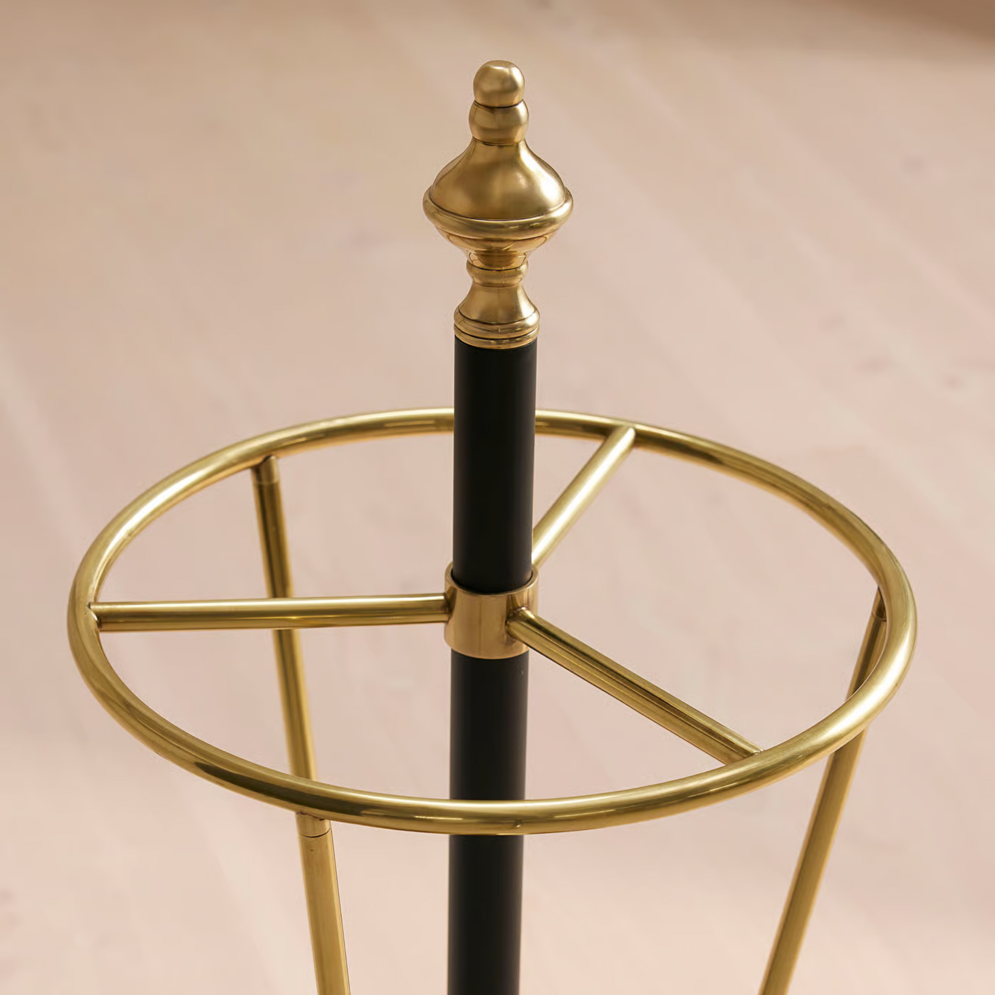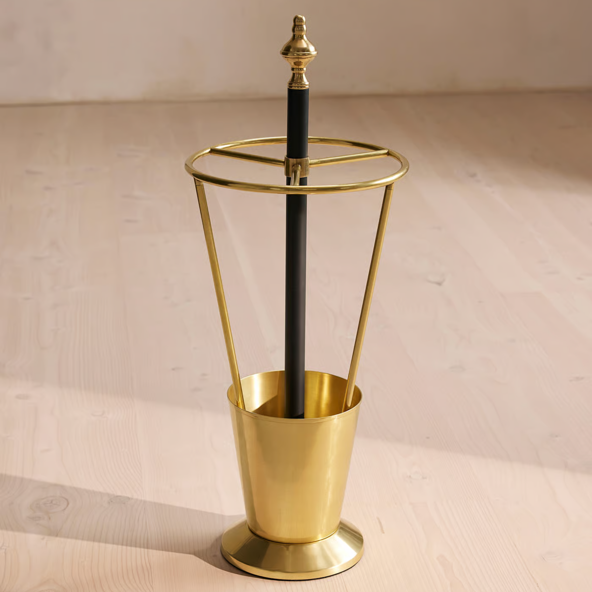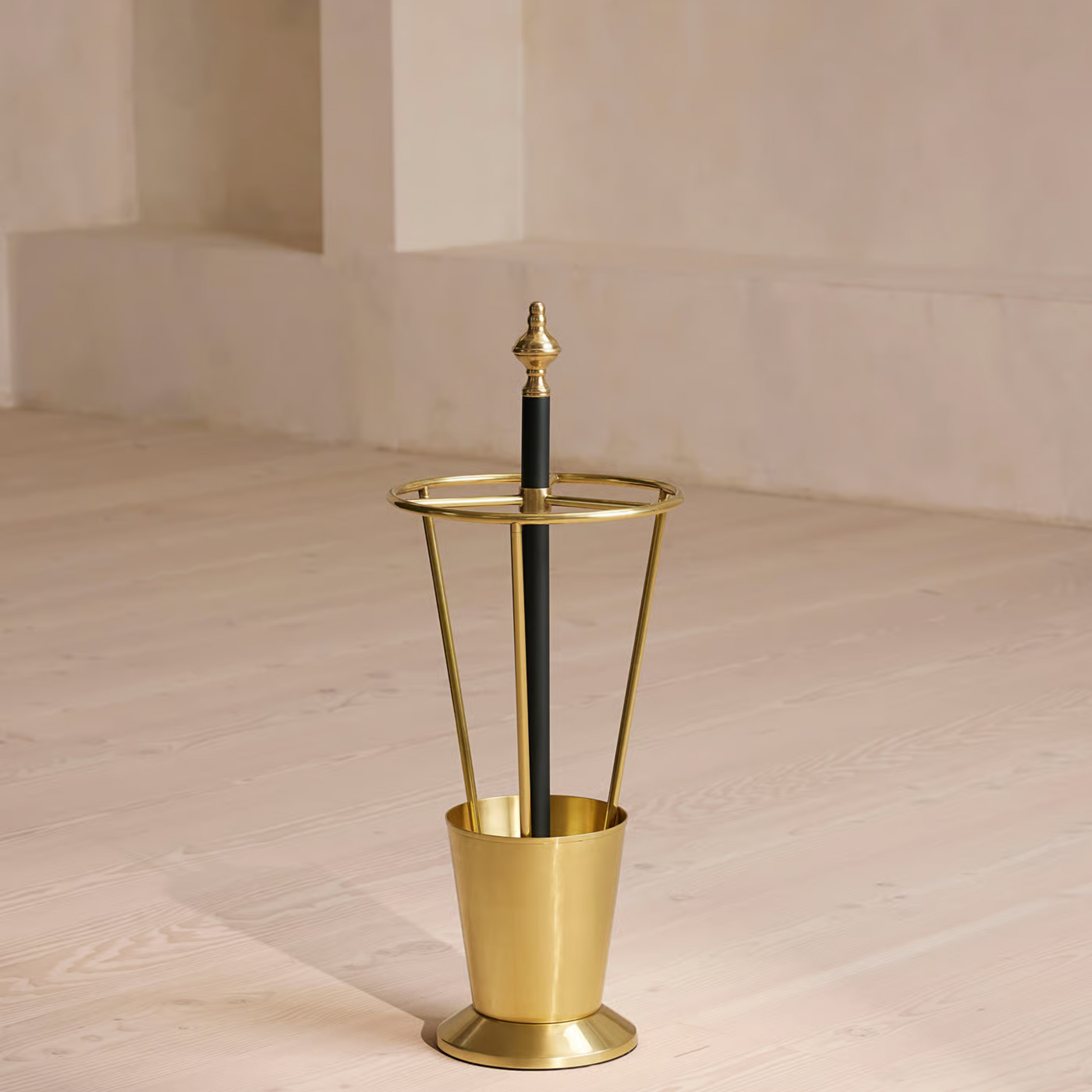 A sculptural umbrella stand that blends classic detailing with modern metalwork. The two-tone brass frame creates a warm, elegant contrast, while blackened accents bring refined structure to the piece. Its solid angular base adds stability and a touch of contemporary sophistication, making this stand a functional and stylish addition to any entryway.