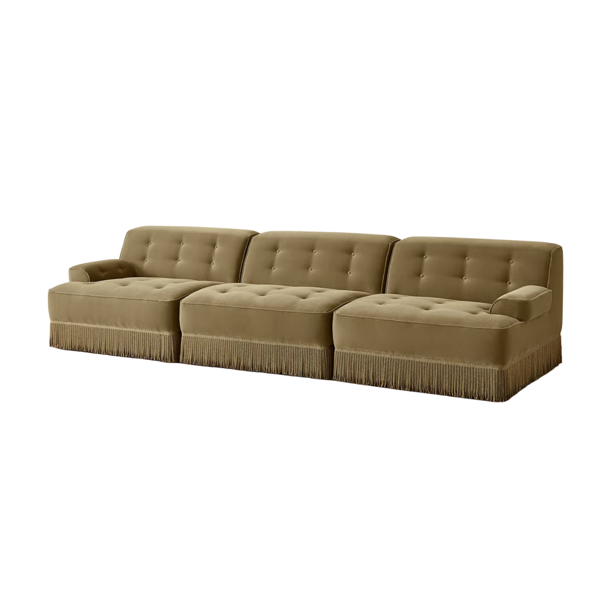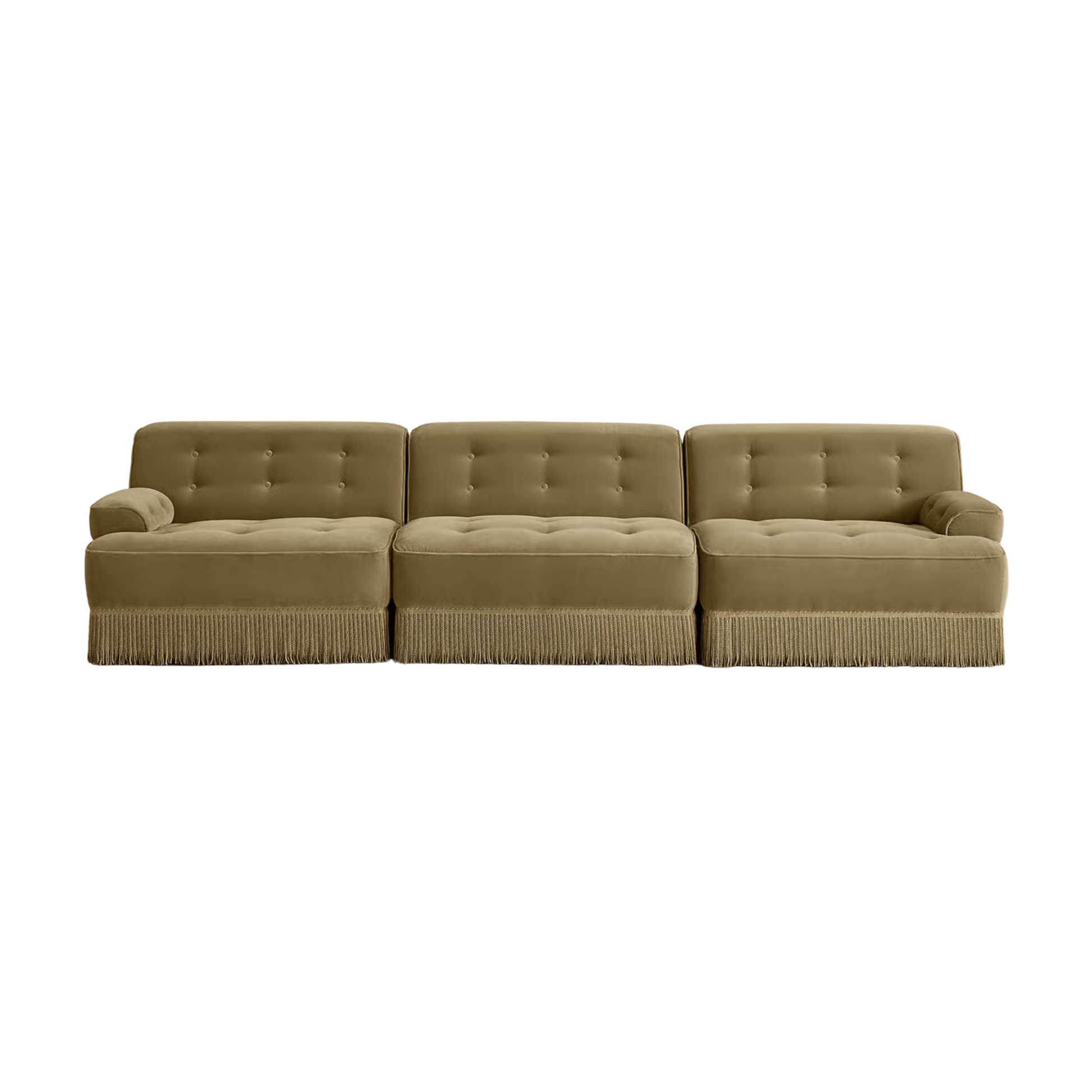 A sculptural, low-profile sectional defined by tailored upholstery and tonal detailing. The generous seat cushions, tufted accents, and soft velvet create an elevated yet relaxed silhouette that anchors a modern living space.