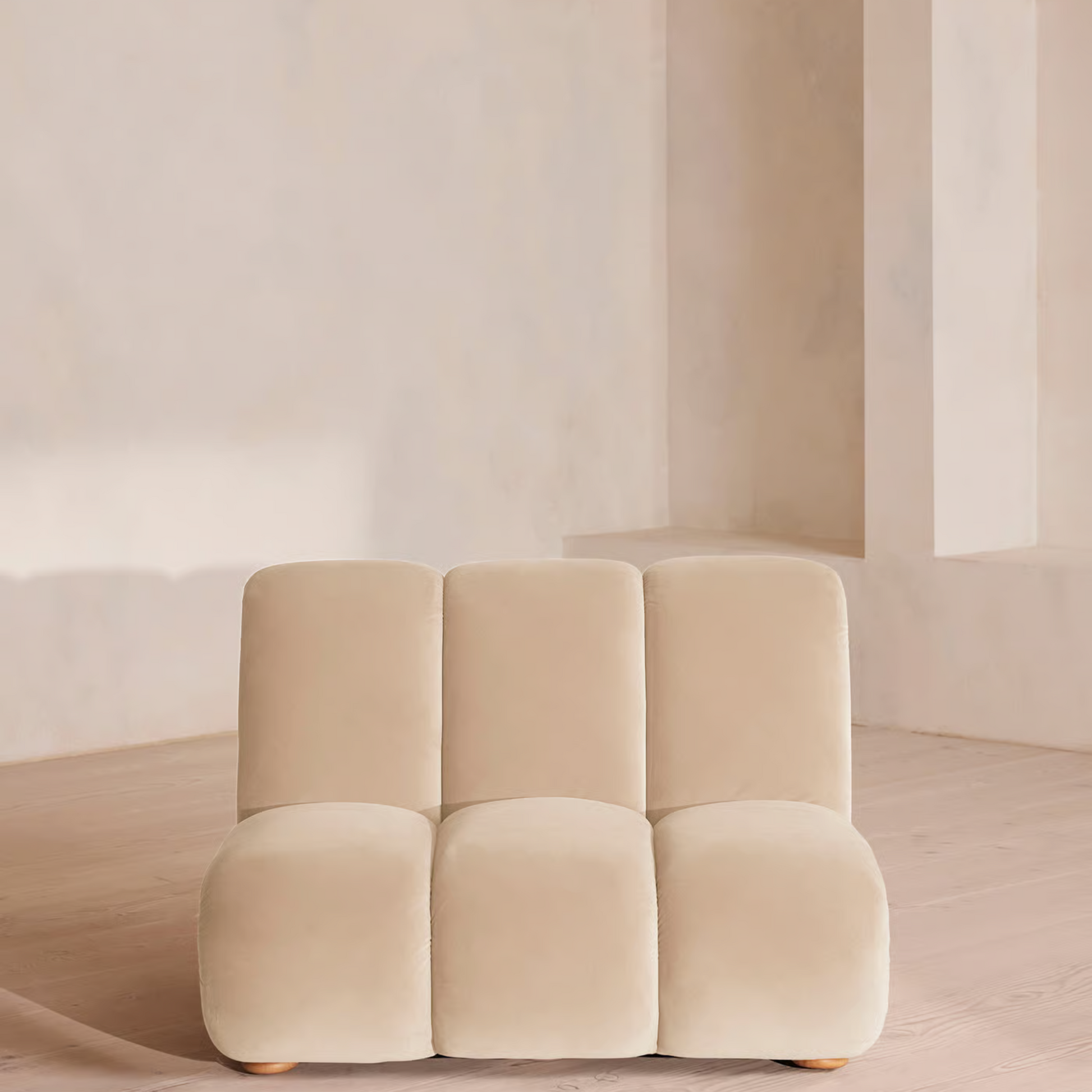 Upholstered in soft Velvet Porcelain for a warm, neutral aesthetic